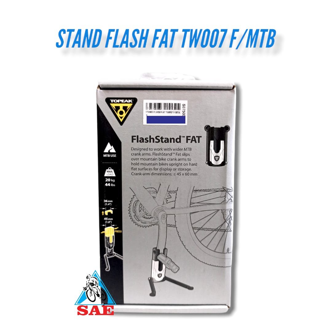 Dirancang untuk bekerja dengan crankarm MTB yang lebih lebar, FlashStand FAT tergelincir di atas crankarm sepeda gunung sisi non-drive untuk menahan sepeda gunung tegak di permukaan datar yang keras untuk dipajang atau disimpan. Saat dilipat, FlashStand FAT cukup ringkas untuk dimasukkan ke dalam saku jersey. Dibangun dari aluminium dan polimer tingkat rekayasa untuk kekuatan dan ringan.